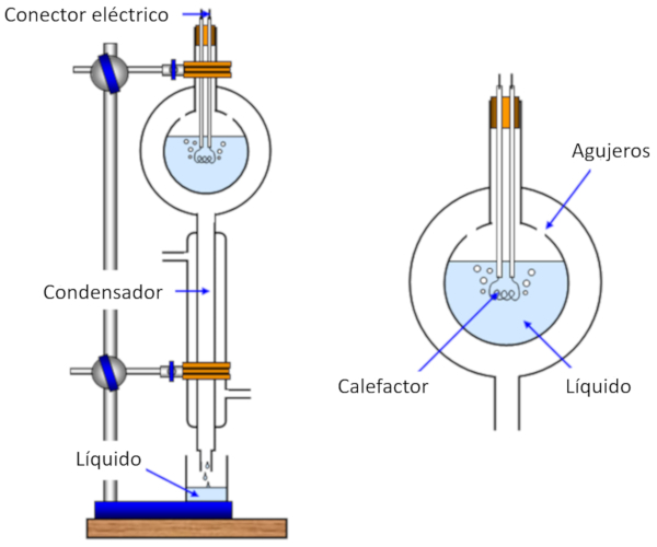 La medición del calor de evaporación se lleva a cabo calentando una muestra, lo que la hace evaporarse, mientras al mismo tiempo se mide el calor suministrado a la muestra. Luego, el vapor se enfría y se condensa, y se mide la masa que originalmente se evaporó.
