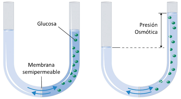 Cuando se coloca una membrana semipermeable en el fondo de un tubo en forma de U y se agrega agua, se puede observar que al agregar material disuelto, la columna con el soluto se eleva:
