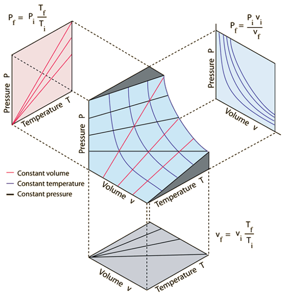 Les trois lois des gaz (loi de Boyle-Mariotte, loi de Charles, loi de Gay-Lussac) et le principe d'Avogadro peuvent être combinés en une seule loi appelée la loi des gaz parfaits.