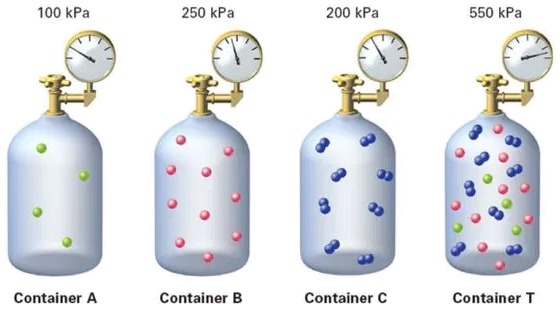 Específicamente, si tenemos tres componentes con sus respectivas presiones parciales, al mezclarlos, la presión total será la suma de las presiones parciales: