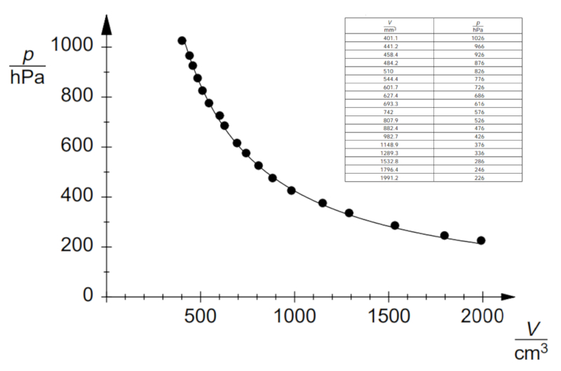 Isso demonstra a Lei de Boyle, que estabelece que a pressão $p$ e o volume $V$ variam inversamente de acordo com a seguinte relação: