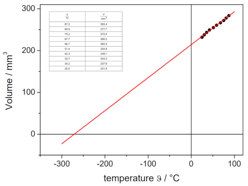Se o experimento for realizado com um volume e quantidade de moles de gás definidos, podem ser obtidos dados como listados e representados no seguinte gráfico:
