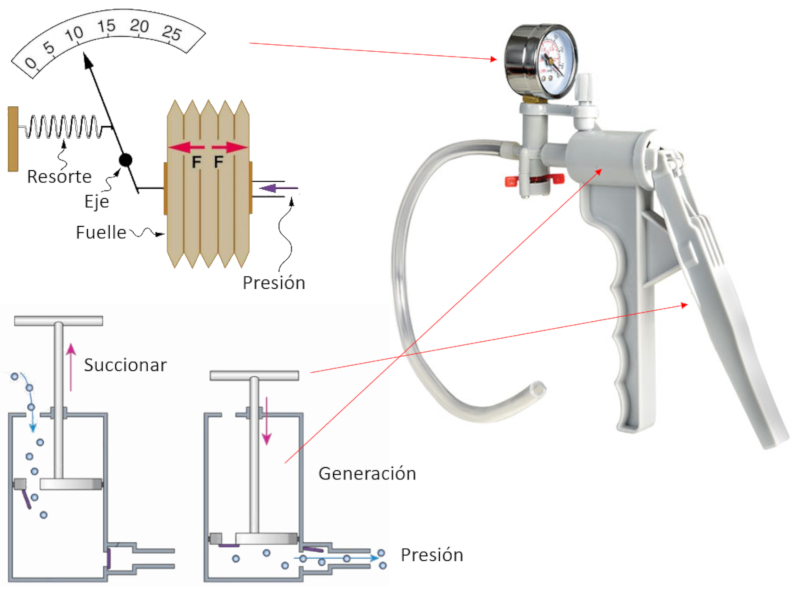 A pressão alcançada é medida mecanicamente, pois há uma membrana conectada a uma agulha que se move de acordo com esse deslocamento, indicando a pressão alcançada.