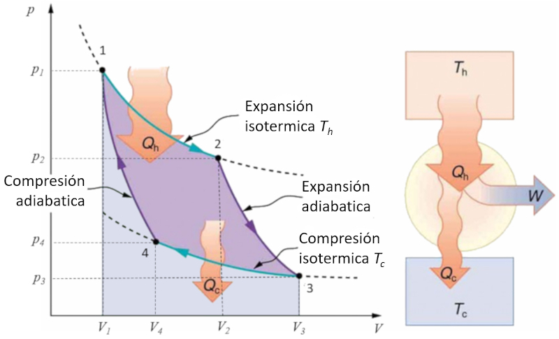 Sadi Carnot introduced [1] the theoretical concept of the first machine design that, based on a heat gradient, can generate mechanical work. This is achieved through a process in the pressure-volume space where heat is added and extracted, as illustrated in the image: