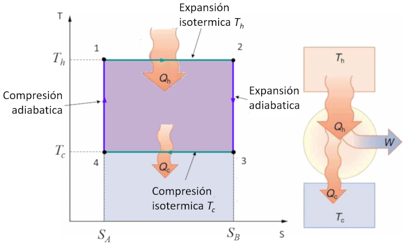 Consultando el gr fico temperatura-entrop a, podemos ver que el calor absorbido el calor suministrado ($Q_H$) es igual a la temperatura alta ($T_H$) debido a la diferencia de entrop a, es decir, la entropía alta ($S_H$) y la entropía baja ($S_C$):