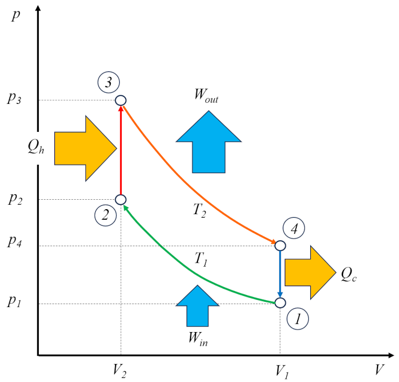 Sadi Carnot introduced [1] the theoretical concept of the first machine design that, based on a heat gradient, can generate mechanical work. This is achieved through a process in the pressure-volume space where heat is added and extracted, as illustrated in the image: