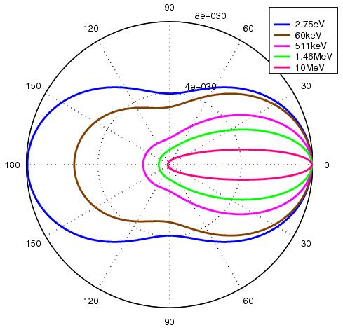 La sección eficaz del scattering de Compton según el modelo de Klein-Nishina se deja representar en función del angulo de scattering como se ve a continuación: