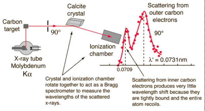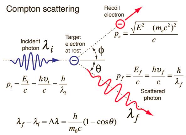 El scattering de Compton ocurre entre un fotón y un electron de un atomo y lleva a la ionización de esta último: